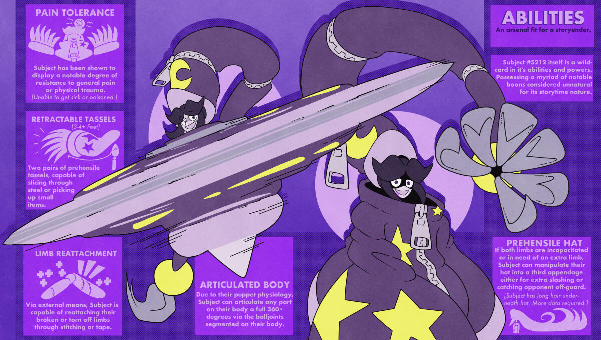 Articulated Body: Due to their doll-like physique, Enty's body is composed of flexible joints that allow them to contort or contract their body in ways not feasibly possible for an average humanoid skeletal structure. With it, they can rotate their claws like circular saws or even their entire body like a spinning top of carnage.
